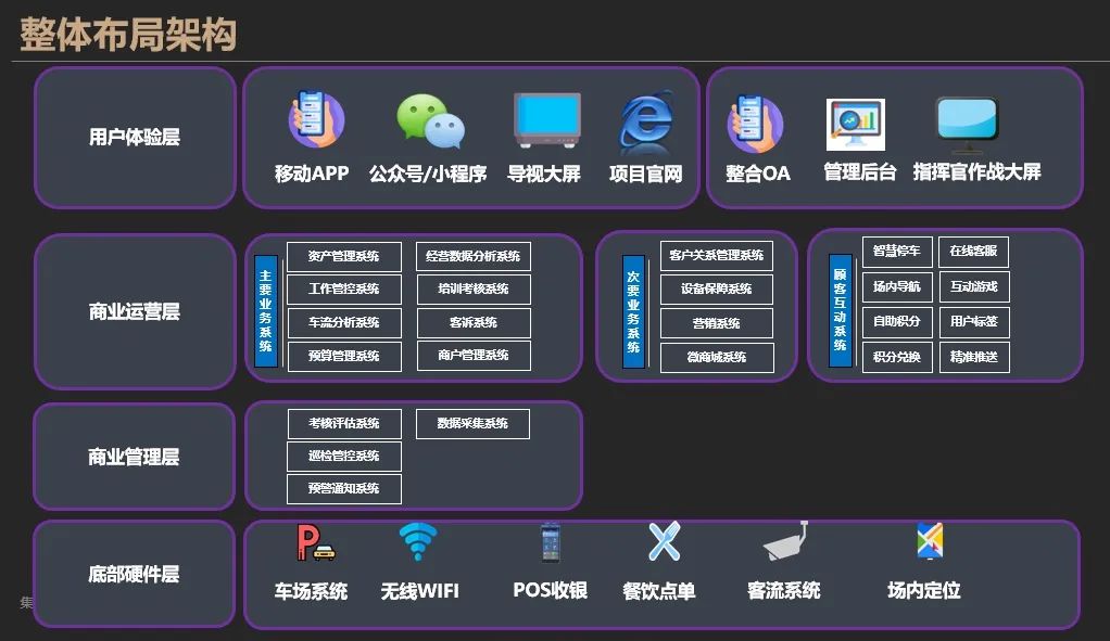 每一位信息人心里都有一本九陰真經,類似于所有供應商解決方案圖,可以展示比較復雜的架構和多維度的層次。這都是經過多年摸爬滾打學習來的自己認為能Hold住的范圍。本人也不例外,我規劃的方案圖分軟硬件兩個維度,涵蓋底部硬件層、商業管理層、商業運營層、用戶體驗層,每一層又分很多小業務系統和硬件來支撐。