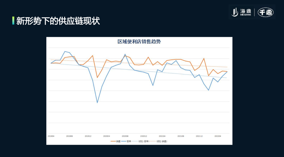 第二張圖是某個區(qū)域便利店的銷售數(shù)據(jù),可以看到從2020年至今,銷售額谷底出現(xiàn)在2020年疫情剛爆發(fā)的時候,而且銷售趨勢線和客流趨勢線相隔越來越遠,這意味雖然單價好像提高了,但是客流卻減少了,整體呈現(xiàn)下行趨勢。
