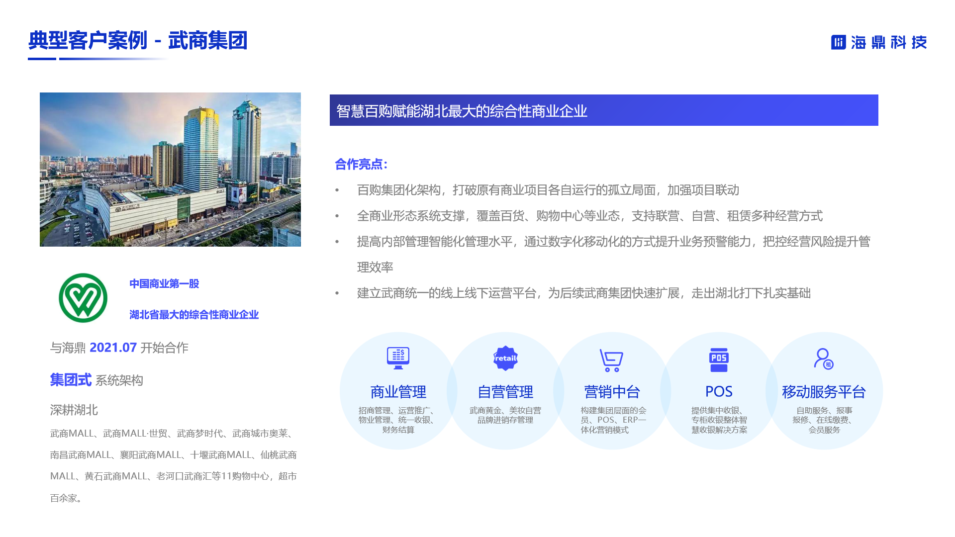 在此期間,海鼎科技與武商集團(tuán)深度合作,共同推進(jìn)著智慧商圈的規(guī)劃與落地。通過商業(yè)運(yùn)營管理、自營管理、營銷中臺(tái)、集中收銀、移動(dòng)服務(wù)等多維度數(shù)智化改造工作,海鼎科技方案產(chǎn)品正支撐武商集團(tuán)旗下眾多商業(yè)體實(shí)現(xiàn)轉(zhuǎn)型升級(jí),為武商集團(tuán)創(chuàng)造全新發(fā)展動(dòng)力。