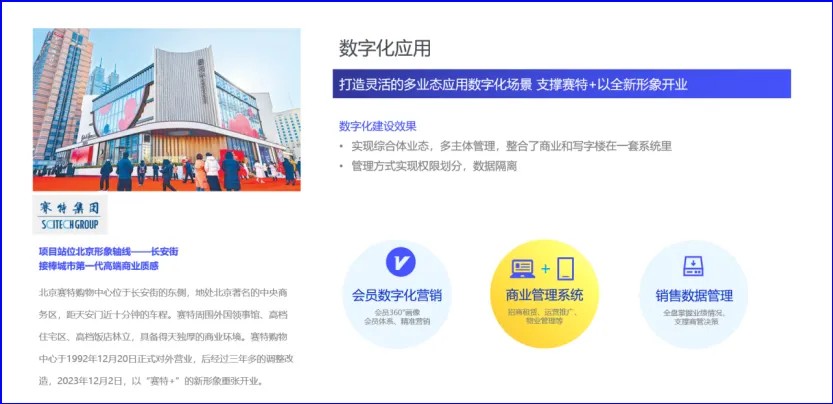 ?多業態整合與靈活管理?:靈活的多業態應用數字化場景將商業和寫字樓整合在一套系統內,同時實現了權限劃分和數據隔離。這一創新舉措不僅提升了管理效率,還為賽特+的業務拓展提供了更多可能性。